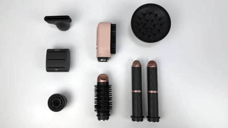 Das Produkt wird mit einem umfangreichen Set an Aufsätzen geliefert und deckt damit viele Styling-Wünsche ab. Für Locken stehen automatische Auto-Wrap-Aufsätze (links und rechts, 32 mm) zur Verfügung, die das Haar selbstständig um den Luftstrom legen.
