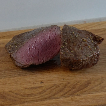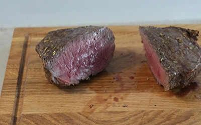 Das Steak war nach dem Garen durch, aber dennoch schön saftig. Wer es stärker durchgegart bevorzugt, kann die Garzeit einfach verlängern.