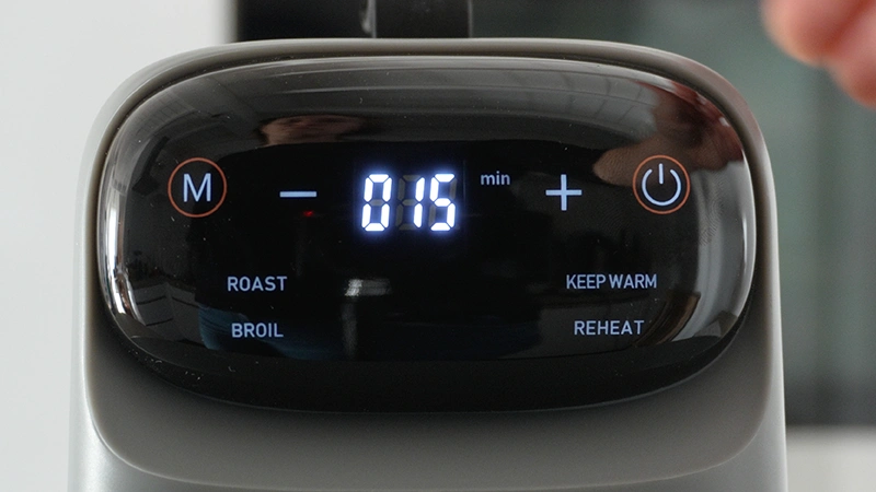 Wer die Dreame Tasti 5-in-1 zum ersten Mal nutzt, findet sich schnell zurecht – die Bedienung ist bewusst einfach gehalten. Das Gerät arbeitet mit einem Temperaturbereich von 60 bis 200 Grad Celsius, der je nach Programm automatisch gewählt wird. Insgesamt stehen fünf Programme zur Verfügung: der Air-Fryer-Modus für klassisches Heißluftfrittieren, der Roast-Modus zum Backen und Braten, der Broil-Modus als Grillfunktion sowie zwei Zusatzfunktionen zum Aufwärmen und Warmhalten.