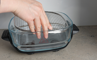 Der Aufbau ist unkompliziert: Die Frittierplatte wird in den Glasbehälter eingesetzt, der PowerCore aufgesetzt und anschließend das gewünschte Programm gewählt. Die mitgelieferte Silikonmatte dient dabei als sichere Ablage für die heiße Heizeinheit.