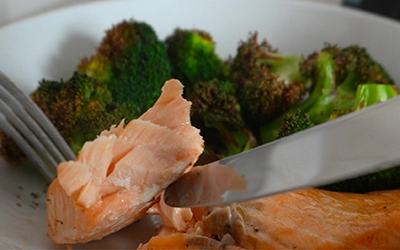 Im Roast-Modus wurden Lachs und Brokkoli zubereitet. Trotz der Zugabe von etwas Wasser wurde der Brokkoli relativ schnell trocken, während der Lachs hervorragend zart und gleichmäßig gegart war. Für Fisch ist der Roast-Modus somit ideal geeignet, während empfindliches Gemüse weniger davon profitiert.