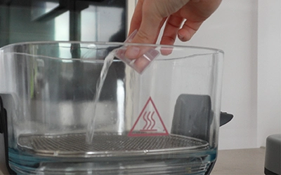 Der PowerCore muss grundsätzlich per Hand gereinigt werden, lässt sich jedoch leicht abwischen. Wichtig ist, dass sowohl das Gerät als auch die Glasbehälter vollständig abgekühlt sind, bevor sie gereinigt werden, um Spannungsrisse oder Beschädigungen zu vermeiden.