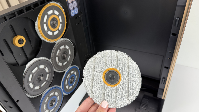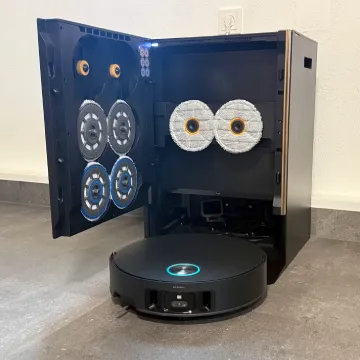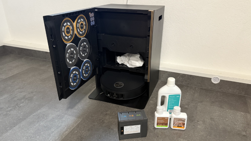 Die Verarbeitungsqualität ist wie gewohnt hoch, die Optik luxuriös. Erstaunt waren wir allerdings über die Größe der Station – mit 416 × 457 × 590 mm ist sie fast 8 cm breiter als jene des X50 Ultra. Die komplexe Moppwechsel-Technik, die sich darin verbirgt, muss schließlich auch irgendwo untergebracht werden.