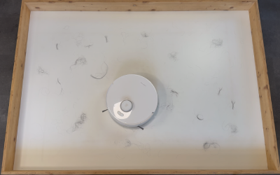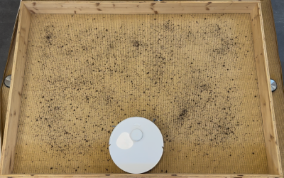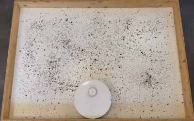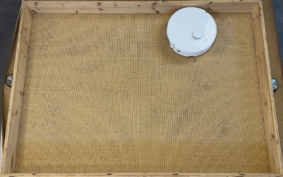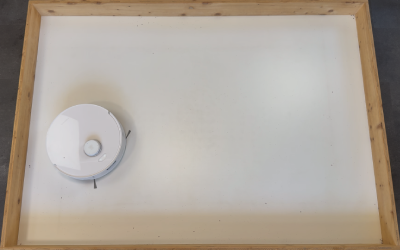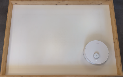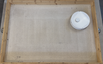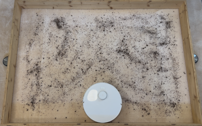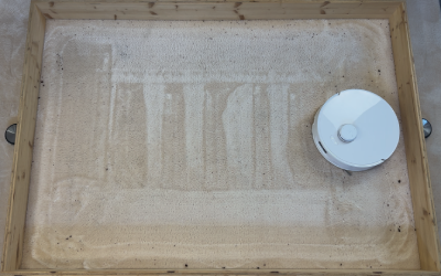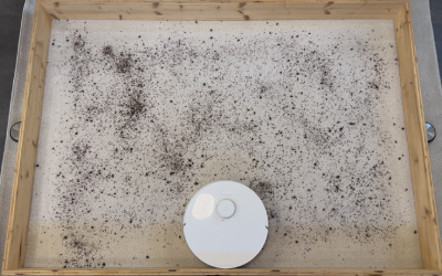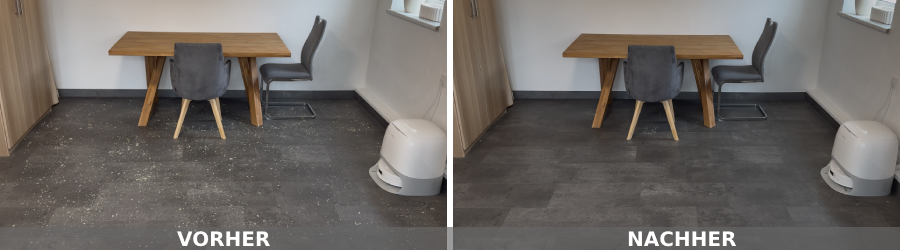 In unserem rund 10 m² großen Testraum, den wir mit Sägespänen verschmutzt haben, zeigte der Roboter ein sehr systematisches Verhalten. Er beginnt an den Kanten, arbeitet die Fläche anschließend in geraden Bahnen ab und ändert beim zweiten Durchgang automatisch die Richtung. So entsteht ein sehr gründliches Schachbrettmuster.