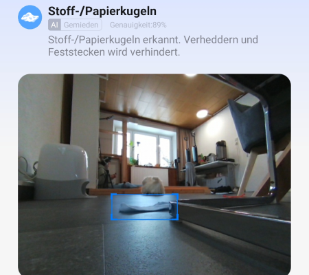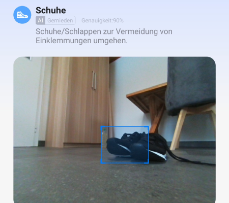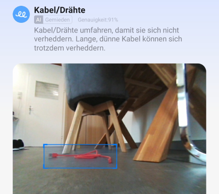 Dank Kamera, strukturiertem Licht und KI erkennt der Roboter viele typische Hindernisse wie Kabel oder Socken zuverlässig und umfährt sie im Alltag sicher.