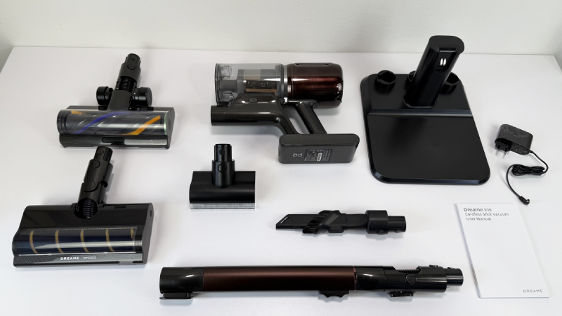 Schon beim Auspacken macht der Dreame V30 einen sehr hochwertigen Eindruck. Der Lieferumfang ist erfreulich umfangreich und deckt alle wichtigen Einsatzbereiche im Haushalt ab. Mitgeliefert werden das Hauptgerät, das Saugrohr, eine weiche GapFree-Rollenbürste für Hartböden, eine Teppich- bzw. Universalbürste, ein flexibles Knickrohr, eine elektrische Mini-Bürste für Polster und Matratzen, ein Kombinationsaufsatz für enge Zwischenräume sowie die Ladestation. Damit ist der V30 ab Werk bestens ausgestattet. Ganz so viel Zubehör wie der Dreame Z30 bietet er allerdings nicht.