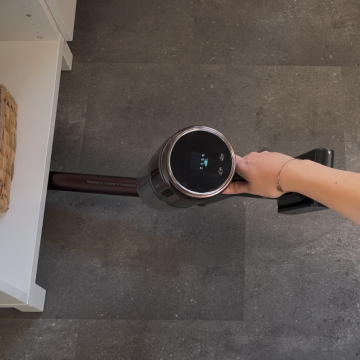 Natürlich kann man mit dem Akkusauger auch auch einfach flach unter Möbel gleiten. Deutlich komfortabler ist es jedoch, wenn man die integrierte Knickfunktion im Saugrohr nutzt. Per Knopfdruck lässt sich das Rohr abwinkeln, sodass der Sauger mühelos unter niedrige Betten, Sofas oder Kommoden gelangt – ganz ohne sich zu bücken. Das schont den Rücken und ermöglicht eine gründliche Reinigung, selbst in schwer erreichbaren Bereichen. Dass das Saugrohr zusätzlich in der Höhe verstellbar ist, steigert den Komfort und vor allem auch die Reichweite nochmal deutlich.
