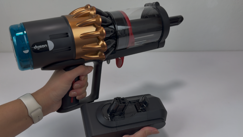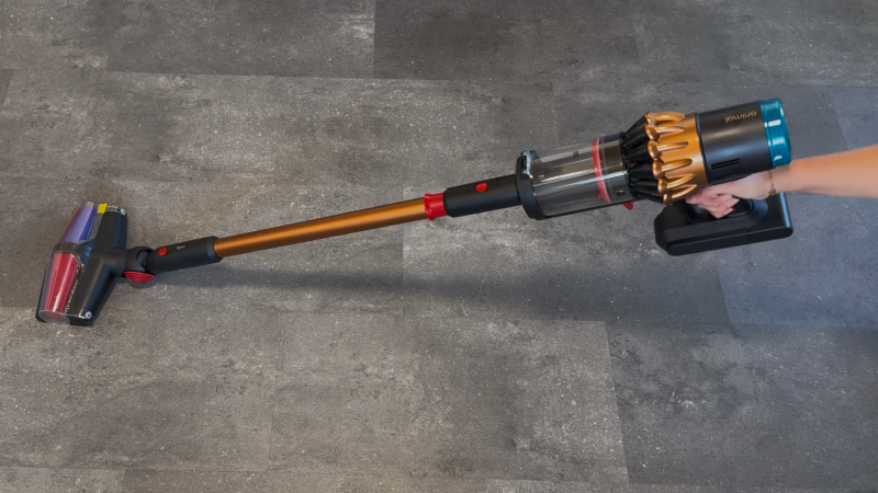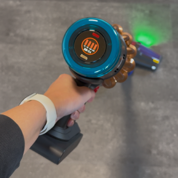 Der Dyson V16 läuft nach einmaligem Drücken dauerhaft weiter – man muss die Powertaste also nicht permanent gedrückt halten.