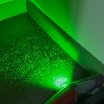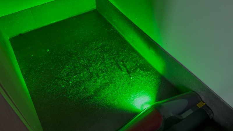 Die grüne Bodenbeleuchtung macht jedes noch so kleine Staubkorn sichtbar.